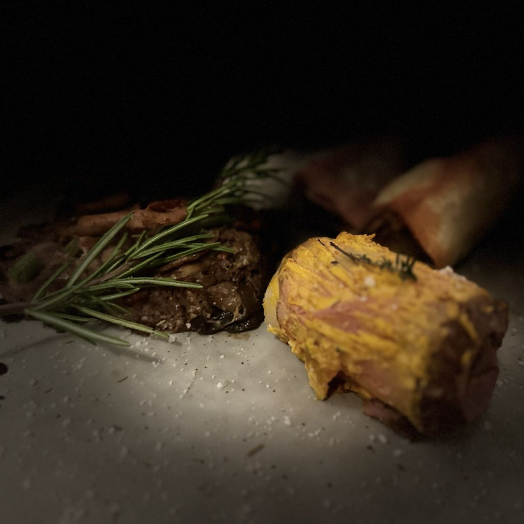Braiseret krondyr og oksekød med hvid trøffelsauce, champignon, svampe og løg. Cigare de pommes de terre